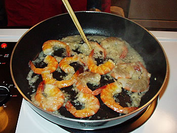 (5)フライパンに(4)をどさっと入れて炒めます。オリーブオイルがエビを香り豊かに焼き上げます。エビが赤く丸くなってきたら出来上がりです。カフクではガーリック・シュリンプにアイスクリーム・スクーパーで盛り付けたご飯が添えられています。