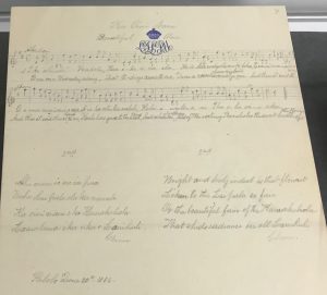 1886年に書かれた自筆の「Ka ‘Oiwi Nani」(Beautiful One)は王女時代に作られた曲です。王室の便せんに手描きの音符やト音記号と歌詞が書かれているのを見たときは鳥肌が立ちました。これはとてもロマンティックな曲ですが、一説によると王室のオーケストラ、ロイヤル・ハワイアン・バンドのディレクターであったヘンリー・バーガーが特別な友であり、恋心を抱いていたかもという話もあります。(ちなみにヘンリー・バーガーはハワイ州歌であるハワイポノイの作曲者であり、作詞は兄のカラカウア王です。)