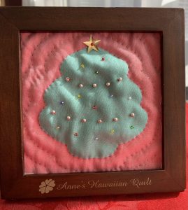 トナカイの小さいタペストリーは少し珍しいデザインです。ハワイアンキルトでは4本足の動物のデザインはあまり使いませんが、クリスマスのデザインでは一度トライしてみたかったです。ハワイアンキルトは100%手作りの為、作業中に作り手であるキルターのマナがそのキルトに宿ると言われています。動物のデザインだと、そのマナで動物がキルトから脱出し、遊び回ってしまうとう言い伝えがあります。このトナカイがクリスマスイブには空を飛び、サンタクロースのお手伝いに出かけるかと思うと、ちょっとワクワクしますね。