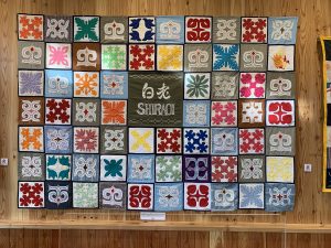 そして今回、白老町の特別な配慮で、私たちも参加させていただいた「ハワイアンキルトとアイヌ刺繍のコラボレーション・フレンドシップキルト」はリムセというフードコートの壁に飾られています。半永久的(笑)に飾られているということなので、ウポポイに行かれる際には絶対にご覧ください! アイヌ刺繍を学ばせていただき、私たちのハワイアンキルトのフレンドシップキルトは、皆さんの気持ちがたくさん入っていて、とてもカラフルで素敵ですね。写真を見るだけでも鳥肌が立ちます。目の前にしたら、もっと感激してしまいそうですね。