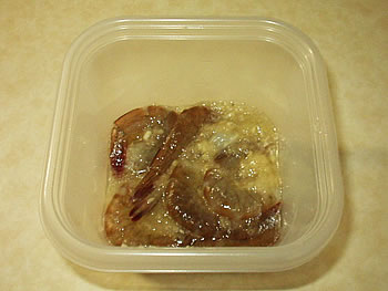 ここで裏技紹介!「下ごしらえがめんどう」とか「玉ねぎやニンニクはちょっと苦手...」という方にお勧めなのは、市販のイタリアン・ドレッシングを使った簡単な調理方法です。タッパーにエビがひたるくらいドレッシングを入れて同じように冷蔵庫でねかせます。メーカーによって塩加減が違うのでフライパンで炒める時に味を調整してください。ビックリするくらい美味しいガーリックシュリンプができあがりますよ。調味料は台所にある物を使えばいいし、お味噌汁の具はわかめやのりみたいなシンプルな感じが良いと思います。