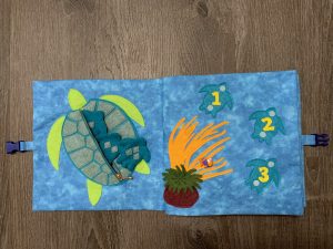 2ページと3ページはホヌのページなので、大きなホヌにはジッパーをつけ、小さいホヌには番号をふり、ジッパーの開け閉めと数の遊び用にしました。
