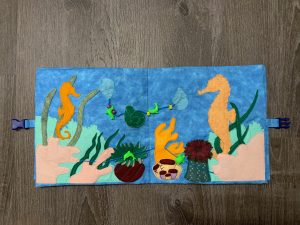 アーチーのビジーブックのテーマはオーシャンにしました。デザインはいろいろなページを(ピンタレストなどの無料のパターン)参考にしました。本になっているので、ページを合わせ、開いたページがうまく繋がるように設計図を作ります。そしてそれに合ったデザインを作っていきます。