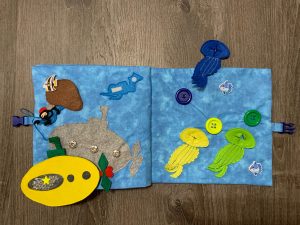 最後の10ページと11ページは海の底をテーマにしました。イエローサブマリンはスナップ、ダイバーのマジックテープ、そしてクラゲはボタン遊びの要素が入っています。ダイバーのフェルト細工が大変でしたが、可愛い孫のためにがんばりました(笑)。買いだめしておいた可愛いボタンなどが使えるのでまた嬉しいですね。