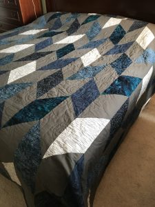 キルティングのデザインや糸も自分で決められます。幾何学模様のデザインなので、柔らかい波のようなキルティングラインを選びました。糸は薄いブルーの色もハワイの海を象徴するようなので選びました。まあすべて娘のリクエストなのですが。そして2週間ほどでキルティングが完成します。そのあとは2.7m角のキルトのバイヤス付けをします。この作業も結構時間がかかる作業になります。そして無事にプレゼントすることができました。すでに使ってくれています。嬉しいですね。