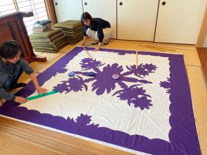 4月からはキルトレッスンも始めました。まずは28cm角のタペストリーをカッティングから開始し、4回で完成までというレッスンです。2回目からは手元を撮っていただけるカメラホルダーなどがあると便利だということもわかり、みなさんの手元もよく見ることができるようになりました。8枚重ねのままのカッティングも実際にやっていただかないと何も学んでいただけません。私は伝統的なハワイアンキルトを皆様にお伝えしているので、この機会にぜひ自己流で続けている方は、一緒にレッスンで学んでいただきたいものですね。そしてデザインを広げ、下地にピンをつける時のこつや、しつけのこつなどをレッスンします。そして最後はアップリケのこつですね。次のレッスンまではアップリケの宿題をやっていただきます。2回目はキルティングの仕方。こちらが本当に難しいのですが、みなさん上手にキルティングできるように必ずなります。正しいキルティングの方法で丁寧にキルティングをしていただくと、素敵な完成品になります。