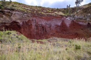 もうひとつの景観は足元の切れ落ちた崖です。真っ赤な壁面が見えますが、これは火口跡ではなく採掘跡なのです。太平洋戦争の際に軍事施設(レーダー用の鉄塔)があり、その撤去跡です。後の撤去作業の際に北側の丘陵部が削り取られ、今日の形になりました。土が赤いのは溶岩の成分中の鉄分が酸化したものです。このようなものは溶岩地帯はもちろん、ハワイ諸島でよく見られますが、このように極めて赤い土は、マウイ島のレッドサンドビーチくらいしか思い浮かびません。