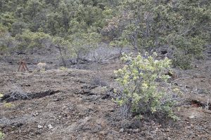 丘を下り北上すると一面の溶岩地帯に出ます。最後の噴火は1868年に起こり、一帯の集落などは壊滅的な打撃を受けました。乾燥した溶岩地帯には特有の自然が広がりますが、牧場であった時代に動植物の多くが姿を消してしまいました。その後、ハワイ固有の植物などを移植したり、保護することで、鳥類などが戻り、少しずつですが、かつての自然を取り戻しつつあります。ここを左(西)に折れ、簡易舗装されている直線道路に出ます。これはかつての滑走路跡です。舗装路の両脇にはプキアヴェやオヒアなどの在来種が増えますが、外来の植物も数多く繁殖しています。